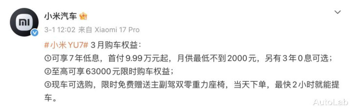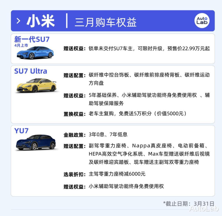 小米YU7比拟2月的策略略有缩水。