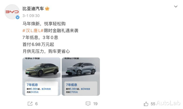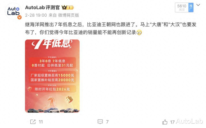 比亚迪也飞快跟进了此次的权柄大战,从2月底起,旗下王朝网、海洋网、方程豹以及腾势品牌,全面铺开7年低息以及3年0息等金融策略。