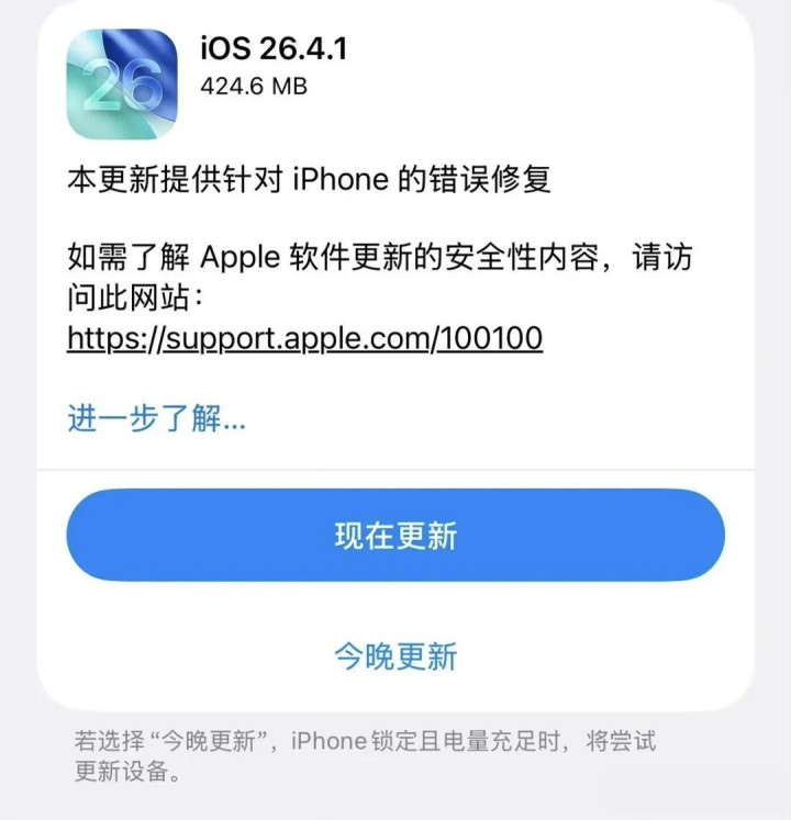 此次郑再版算是环节更新了,距离上一个郑再版iOS 26.4,仅时隔15天资料,并且此次不是“安全蜕变”的补丁版块,而是着实的郑再版块,关于此次的更新变化,官方的阐扬已经很简便:本更新提供针对iPhone 的失实成立。