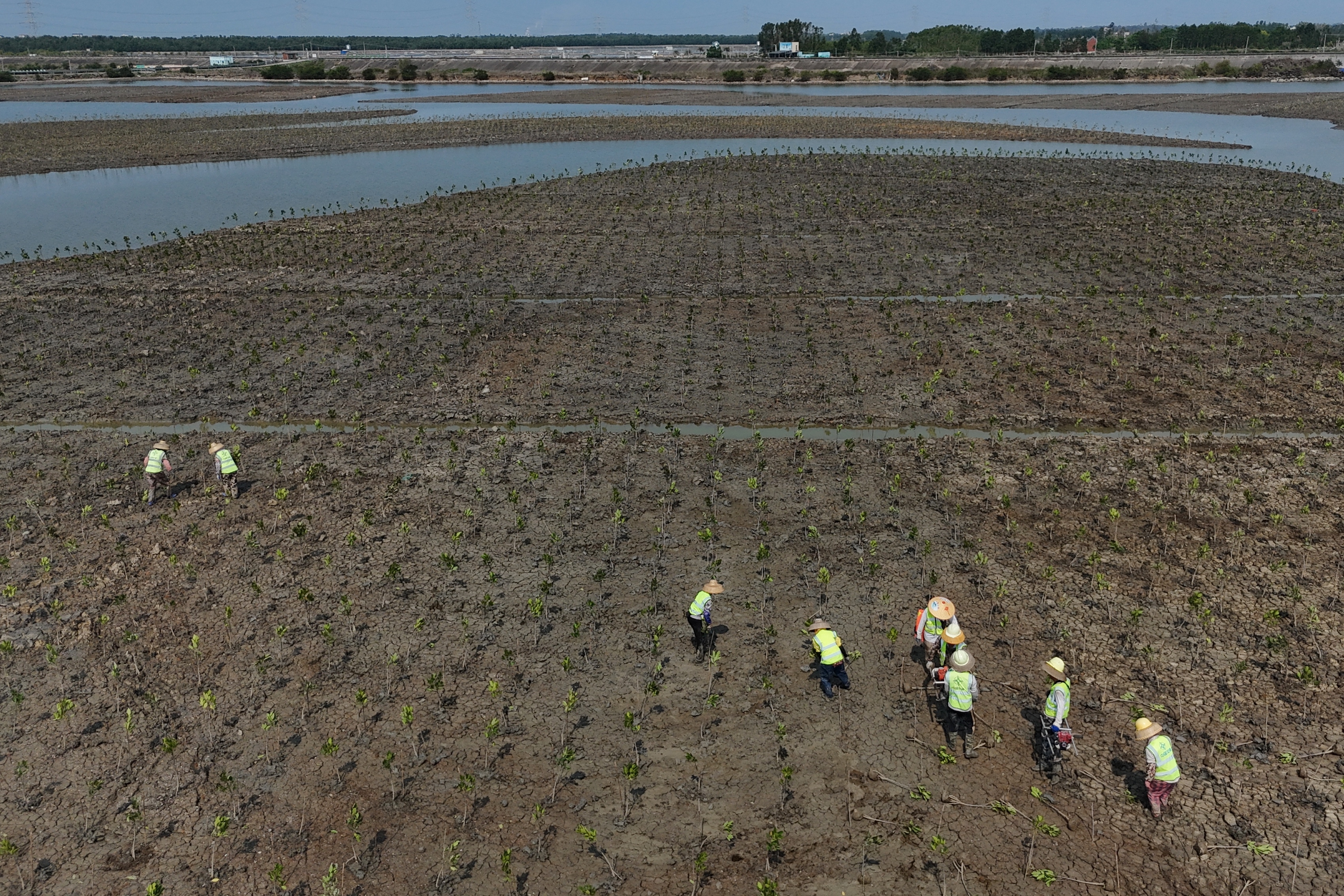 职责主说念主员在湛江红树林保护区金牛岛红树林片区援救红树。