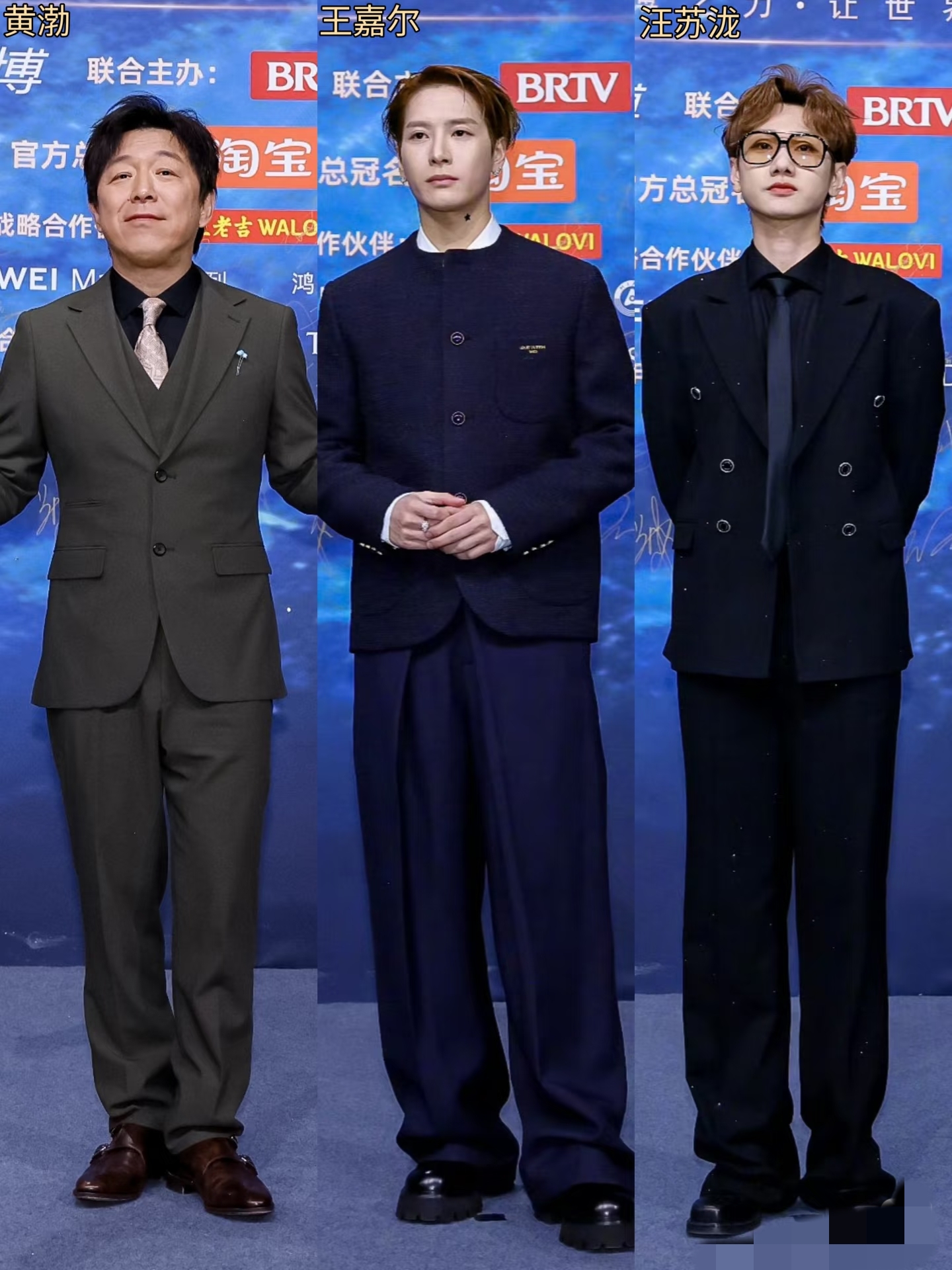 黄渤和他们一双比,确切显得头好大,还自带几分诙谐的效劳。王嘉尔的这个造型看起来显得头发有点秃呀,汪苏泷倒是挺结义的,看来没少扑粉。