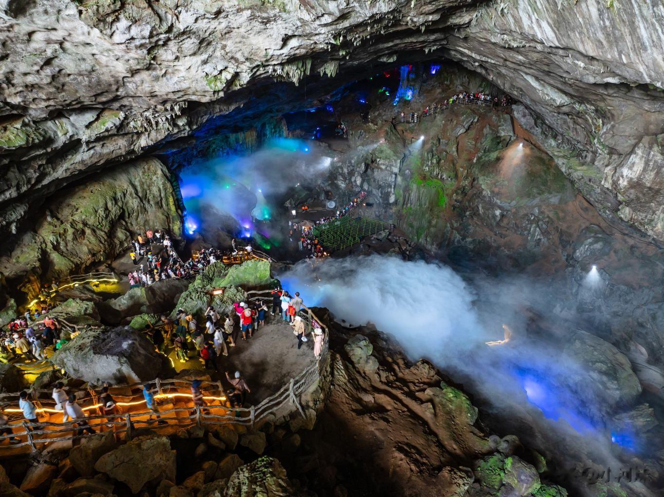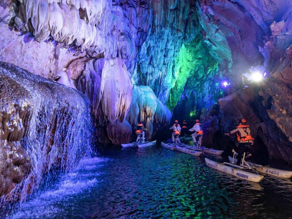 洞内终年保握在18-22℃间,冬暖夏凉。乘一叶轻舟或飘摇飞艇穿行,暗河泛着清透的蓝,穿峡说念、绕险滩,转角再遇国内最大溶洞瀑布群,一动一静间,尽览洞河奇不雅的奥密与壮阔。