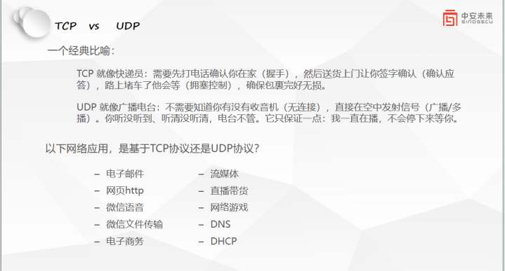 👉 用TCP的场景(要靠谱):微信传文献、淘宝下单支付、发邮件、刷网页,这些王人不可丢数据,全靠TCP撑着;