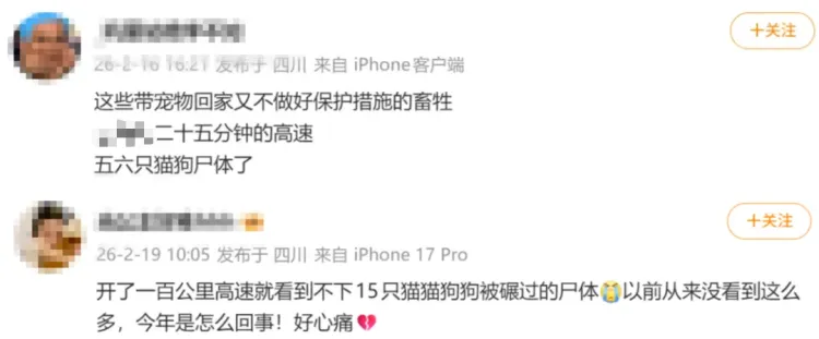 近日,吴先生在乐山开往重庆的约300公里高速路上,累计发现62具猫狗尸体,其中约七八仅仅狗,其余多为猫。他终点提到,部分宠物狗身穿穿着、毛发整洁,显着是家养宠物,揣摸系春节途中因驻守不及际遇事故。