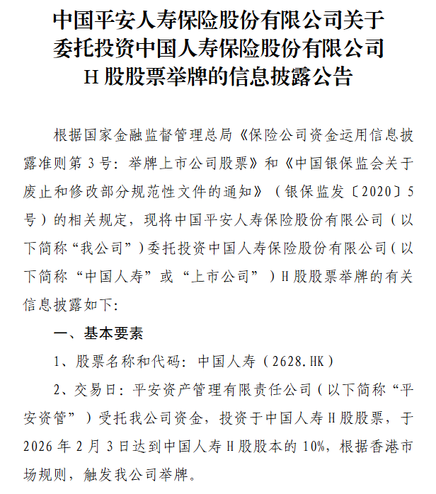 2月10日,祯祥东说念主寿深远公告称,祯祥资管受托该公司资金,投资于中国东说念主寿H股股票,于2月3日达到中国东说念主寿H股股本的10%,笔据香港市集法例,触发举牌。