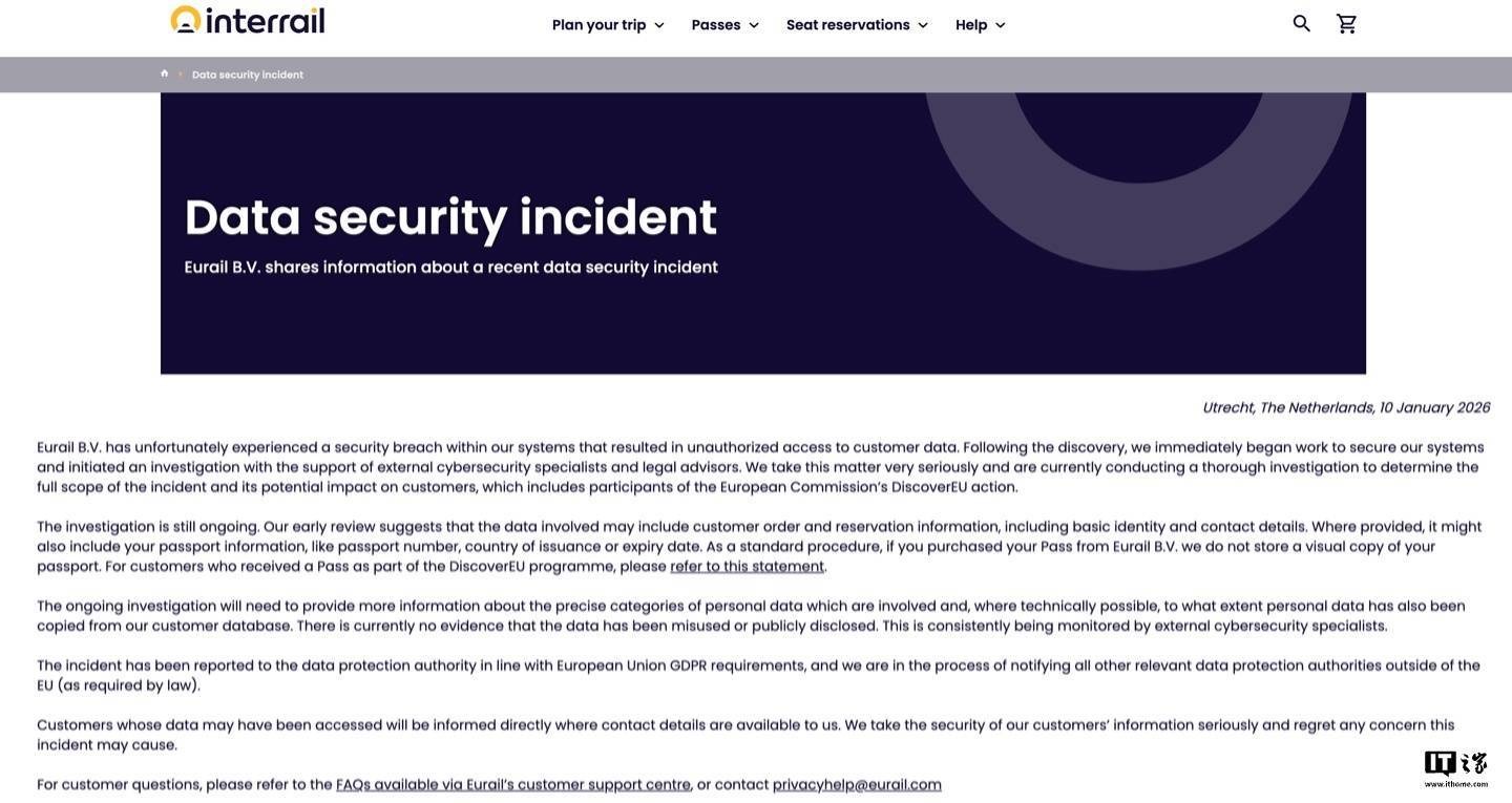 IT之家 1 月 16 日音信,琢磨欧洲铁路通票(Eurail Pass)的公司 Eurail B.V. 上周在官网发布公告,袒露公司碰到黑客报复,部分客户个东说念主苦衷信息外泄。