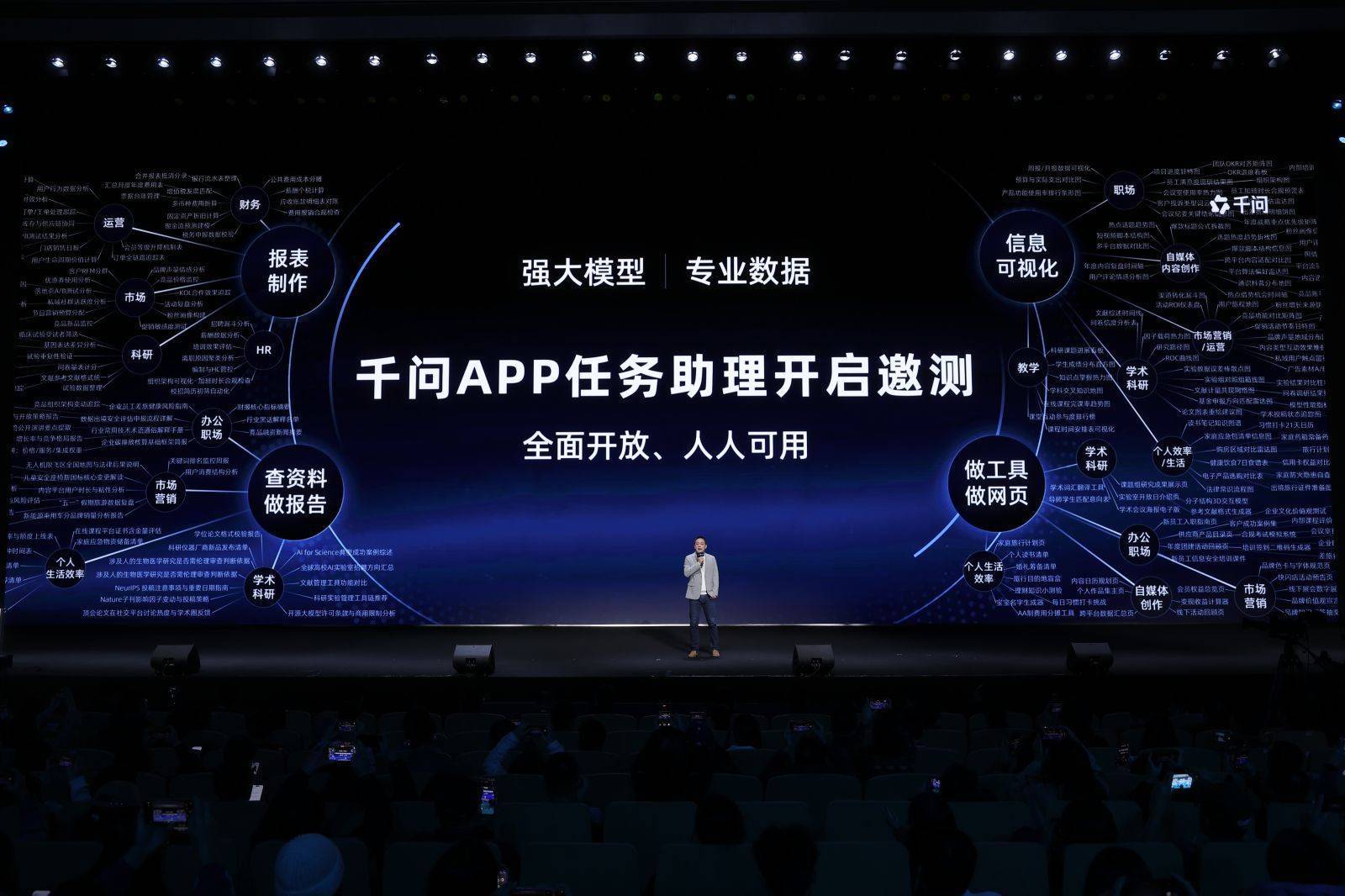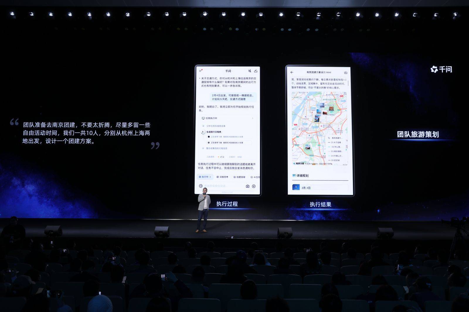 他死后的屏幕上展示着千问的洪志:超越400项新功能,笼罩购物、旅行、政务和生存服务等真实场景。这标记着阿里生态体系正通过AI进行深度整合。