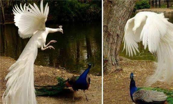 一只白色的孔雀正在升起,周身白净的羽毛鼓胀展现出来,给东说念主一种瞠乎其后的仙气。