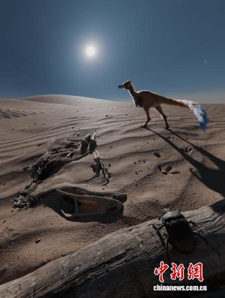 本项探求的恐龙化石回话艺术思象图:约9500万年前,一只警丘纤腿龙在沙漠中正从同类干枯的骨架旁走过(图片作家GabrielDiázYantén)。施普林格·当然供图