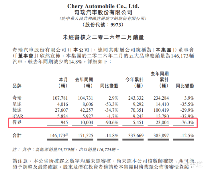 刚刚插足3月份,各大车企纷繁公布了2月份的销量数据,值得轻柔的是,背靠奇瑞和华为的智界汽车销量却令东说念主有些不测。据悉凭据奇瑞汽车发布的销量数据显现,2月份智界汽车的销量仅为945辆,同比下滑了90.6%,如斯大的下滑幅度,在刻下的市齐集并未几见。后据了解,上述数据为智界汽车的批售数据,而具体请托数据以鸿蒙智行公布为准。
