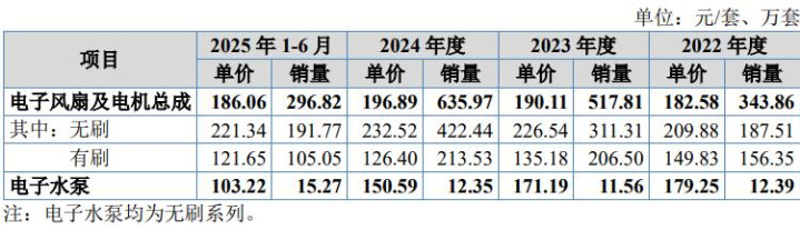 表:2022年至2025年上半年朗信电气主要居品按有刷、无刷分类的单价及销量情况