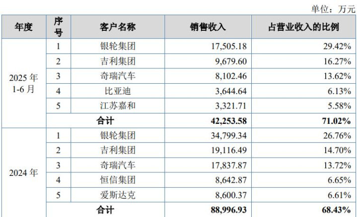 客户层面,朗信电气凭借可靠的居品品性、快速的反映才调与同步拓荒上风,已与比亚迪、奇瑞、祯祥、长安等著名车企建立持久褂讪协作干系,并深度绑定恒信集团、爱斯达克等优质一级供应商;同期依托银轮集团的国外渠谈资源,切入北好意思新动力头部车企供应链,居品远销多个国度和地区,国外业求竣事稳步拓展。2022年至2025年上半年,公司对前五大客户的销售额占营业收入的比例分袂为83.08%、77.22%、68.43%和71.02%,占比合座下跌,客户结构连续优化,筹画抗风险才调抑遏增强。