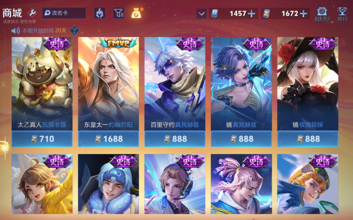 3.史诗皮肤+积分夺宝券+皮肤碎屑=1424限时点券